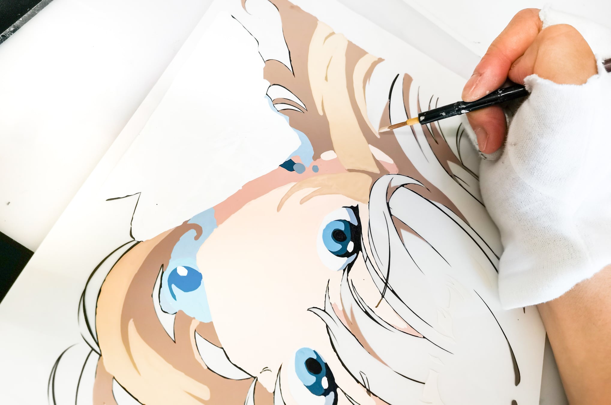 セル画は専用の「セル絵具」を使用し1枚1枚手作業で作成されます。